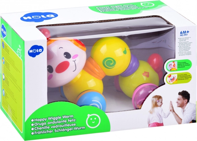 Interaktivna vozeča gosenica Happy Wiggle Worm je idealna igrača za dojenčke in malčke. Po pritisku na hrbet se gosenica raztegne in zapelje naprej po ravni površini, medtem ko glavica menja barve in zvenijo prijetne melodije. Vrtljiva glava spodbuja radovednost in fino motoriko.