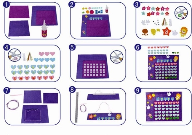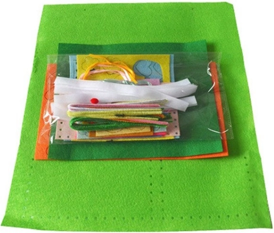Del pakiranja so materiali za enostavno šivanje in lepljenje, zato lahko ustvarite tudi majhen »skrivni žep« za drobne zaklade. Zaradi velike plastične igle in mehkega filca je delo varno in primerno za otroke.