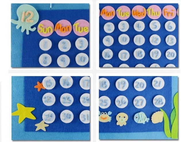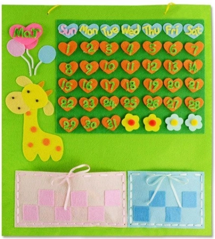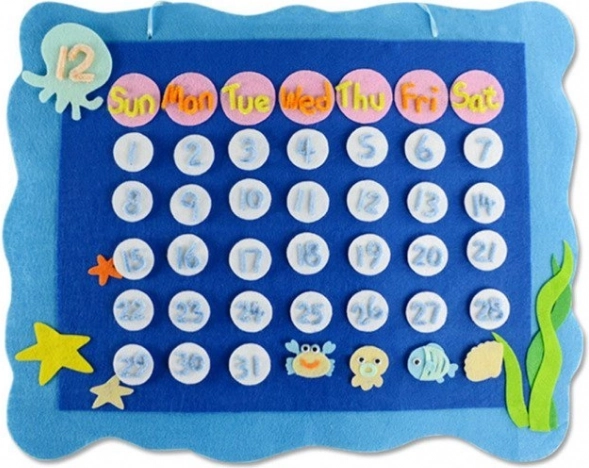 Otroški filc koledar s preglednimi dnevi v tednu in številkami spodbuja spoznavanje časa in vsakodnevnih rutin skozi igro.