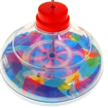 Prosojna kupola omogoča opazovanje barvitega vrtinca v notranjosti, medtem ko trpežna plastika zagotavlja vzdržljivost igrače.