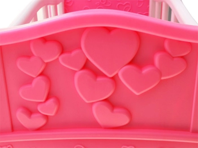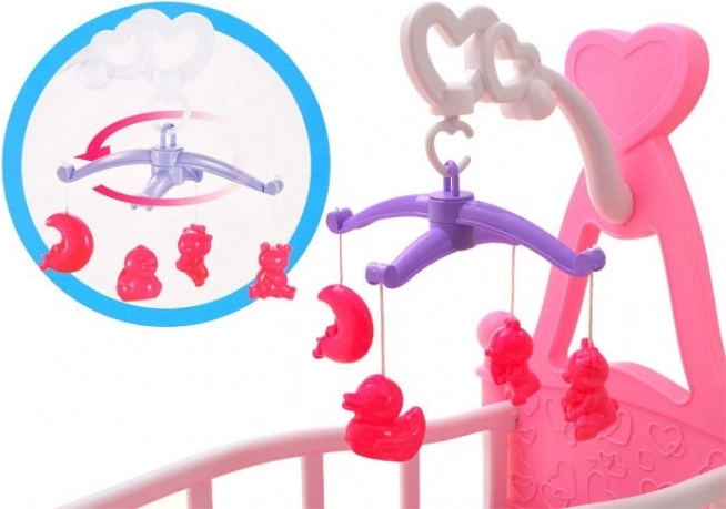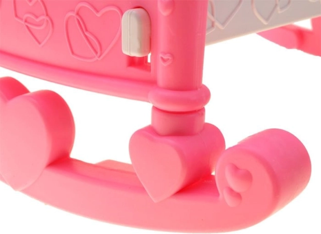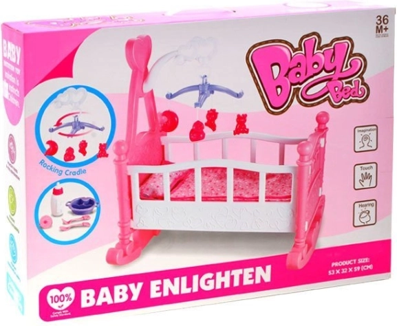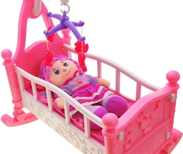 Ta estetsko dovršena zibelka v nežnih rožnato-belih barvah ponuja otrokom avtentično igro skrbi za dojenčka. Zahvaljujoč mehanizmu za guganje in visečemu vrtiljaku z obešenimi elementi ustvarja pomirjujoče vzdušje za punčko. Reliefni srčasti in cvetlični detajli zibelki dodajo čar in spodbujajo domišljijo.