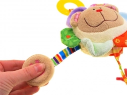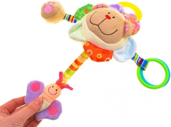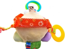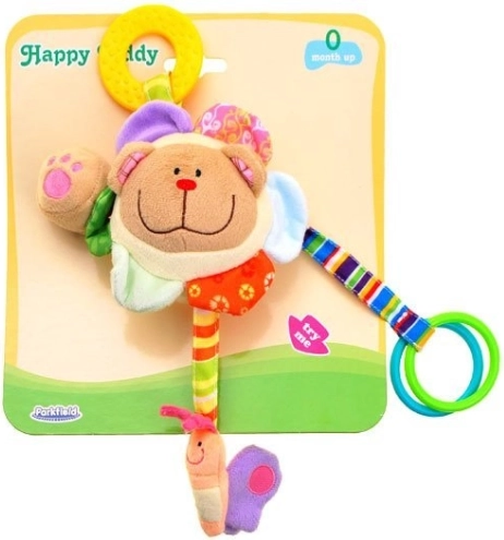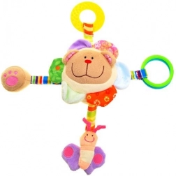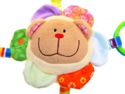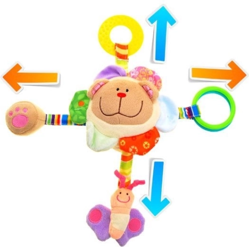 V medvedkovi glavi je ropotuljica, ki ob tresenju oddaja nežen zvok – idealno za pritegnitev pozornosti in spodbujanje gibanja. Viseček vključuje štiri barvite trakove z različnimi igralnimi elementi: