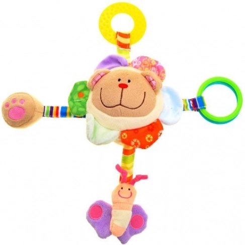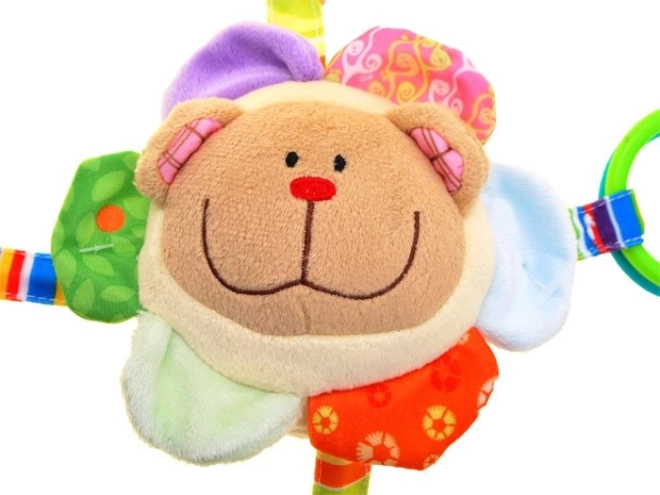 Ta viseček je zasnovan za radovedne dojenčke. Na sredini je prijazen medvedkov obraz, obdan z barvitimi cvetnimi listi, od katerih vsak skriva svoje presenečenje. Listi so izdelani iz različnih materialov: šumečih, mehkih, gladkih – kar otroku omogoča odkrivanje in razvoj tipa ter sluha.
