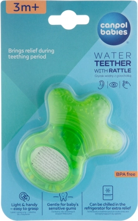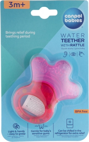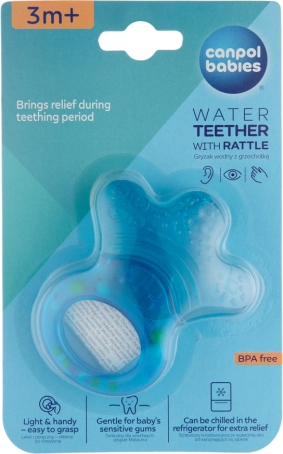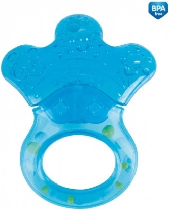 Velik obroč omogoča udoben oprijem, ropotajoče kroglice spodbujajo sluh in vid ter motivirajo otroka k prijemanju in urjenju fine motorike. Grizalo je napolnjeno z mikrobiološko testirano destilirano vodo in je izdelano iz varnih materialov brez BPA.