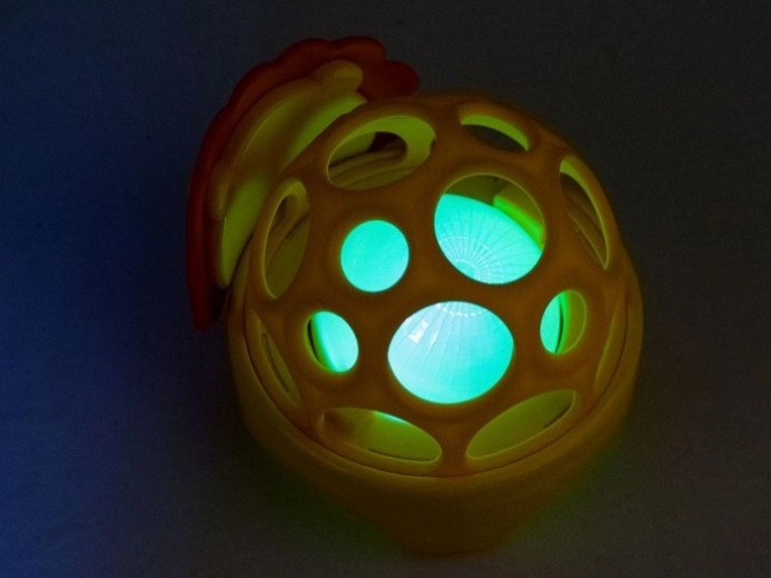 Vzdržljiv material se po stisku vrne v prvotno obliko in prenese vsakodnevno igro – stiskanje, metanje, kotaljenje in žvečenje. Igrača naravno razvija koordinacijo oko–roka, podpira prijemalni refleks in motivira k vlečenju, tresenju in kotaljenju.