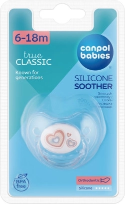 Silikonska dudo je izdelana iz prozornega silikona, ki je popolnoma brez okusa in vonja. Ne vsebuje BPA. V pakiranju 1 kos. Prednosti dud Canpol babies: - dobro se odzračujejo; o tem se lahko enostavno prepričate s stiskom cuclja (ne podcenjujte te lastnosti dud; slabo odzračevanje lahko vodi do deformacije neba in ugriza pri otroku); - prezračevalne odprtine v ščitniku omogočajo kroženje zraka, odvajanje sline in tako preprečujejo draženje kože okoli ust; - obroč na dudi trdno drži, olajša podajanje dudo otroku in omogoča pritrditev verižice za dudo; - dobavljajo se v različnih privlačnih barvah. Dudo dopolnite z verižico v istem dizajnu. Navodila za uporabo: Pred prvo uporabo dudo iz higienskih razlogov sterilizirajte v vreli vodi približno 5 minut. Po ohladitvi iztisnite preostalo vodo iz dude. Pred vsako uporabo dudo temeljito umijte v topli vodi. Ne uporabljajte antibakterijskih ali kemičnih čistilnih sredstev. Pretirana uporaba čistil lahko povzroči poškodbe plastičnih delov. Nikoli ne namakajte dude v sladkih substancah ali zdravilih – izpostavljate otroka nevarnosti nastanka okvar zobne sklenine. Dudo uporabljajte največ 1–2 meseca, nato jo iz higienskih in varnostnih razlogov zamenjajte z novo. Če dudo otroku zdrsne v usta, NE PANICIRAJTE – dudo je zasnovana tako, da je otrok ne more pogoltniti, in jo lahko v takih primerih varno odstranite. Dudo odstranjujte čim bolj previdno. Hranite jo v čistem, suhem in zaprtem etuiju. Priporočamo, da dude ne uporabljate pri otroku, starejšem od 3 let. Pomembno! Za varnost in zdravje vašega otroka! Pred vsakim podajanjem otroku preverite kakovost dude. Kakovost cuclja preizkusite s temeljitim raztezanjem v vse smeri. Ob prvih znakih poškodb dudo takoj zavrzite in je ne uporabljajte več. Uporabljajte le tiste držala za dudo, ki ustrezajo zahtevam standarda EN 12586. Nikoli ne pripenjajte dude na različne vrvice, vezalke ali trakove oblačil. Otrok se lahko zaduši. Dude ne puščajte na neposredni sončni svetlobi, v bližini vira toplote ali v razkužilnih sredstvih dlje, kot je priporočeno – lahko pride do oslabitve cuclja. Silikonska duda ustreza zahtevam: Direktiva Evropskega parlamenta in Sveta 2001/95/ES o splošni varnosti proizvodov, EN 1400-1 Izdelki za nego otrok – Dudi za dojenčke in majhne otroke – 1. del: Splošne varnostne zahteve in informacije o izdelku, EN 1400-2 Izdelki za nego otrok – Dudi za dojenčke in majhne otroke – 2. del: Mehanske zahteve in preskusi, EN 1400-3 Izdelki za nego otrok – Dudi za dojenčke in majhne otroke – 3. del: Kemične zahteve in preskusi.