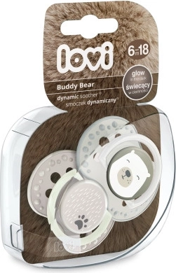 LOVI dinamični silikonski dudo BUDDY BEAR 6–18 m, 2 kosa