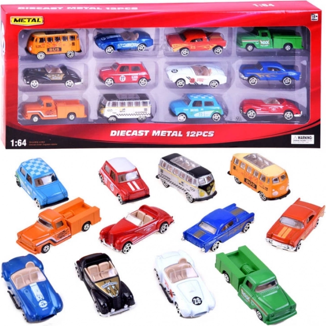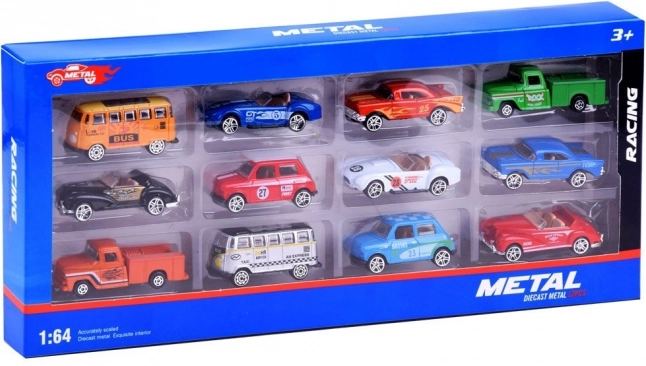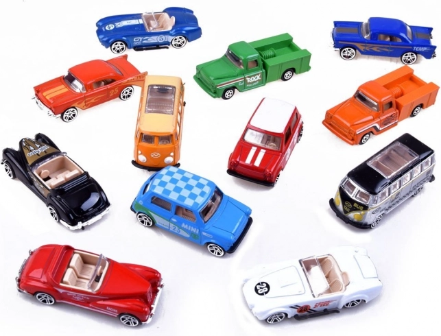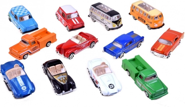Stilski komplet 12 modelov za male in velike ljubitelje avtomobilov: vsako vozilo ima kovinsko karoserijo (die-cast), plastično podvozje in merilo 1:64. Različne barve in oblike v retro slogu, mera enega avtomobila 8 × 3,5 × 3 cm. Odlična izbira za otroke od 3 let in zbiratelje.