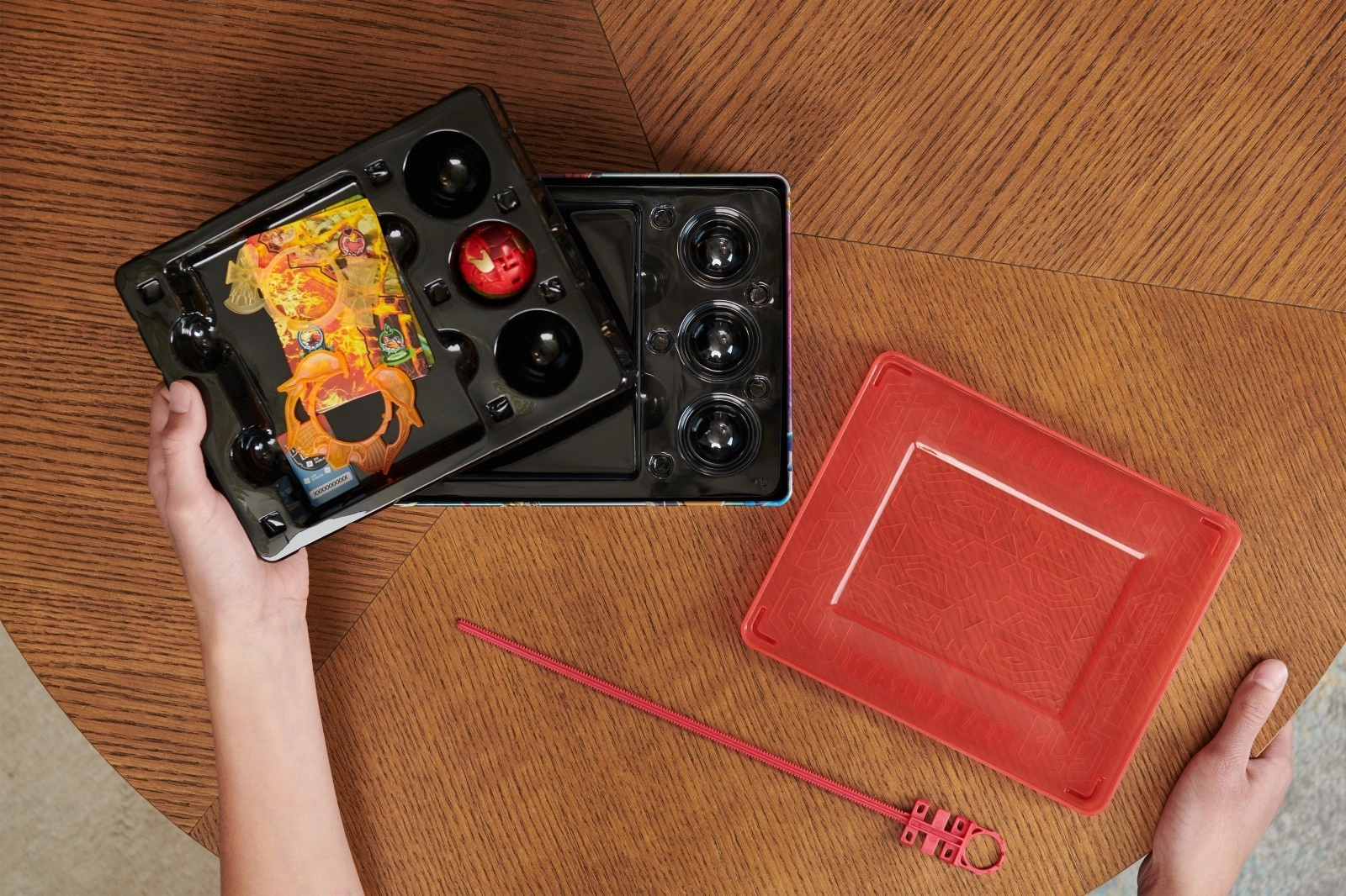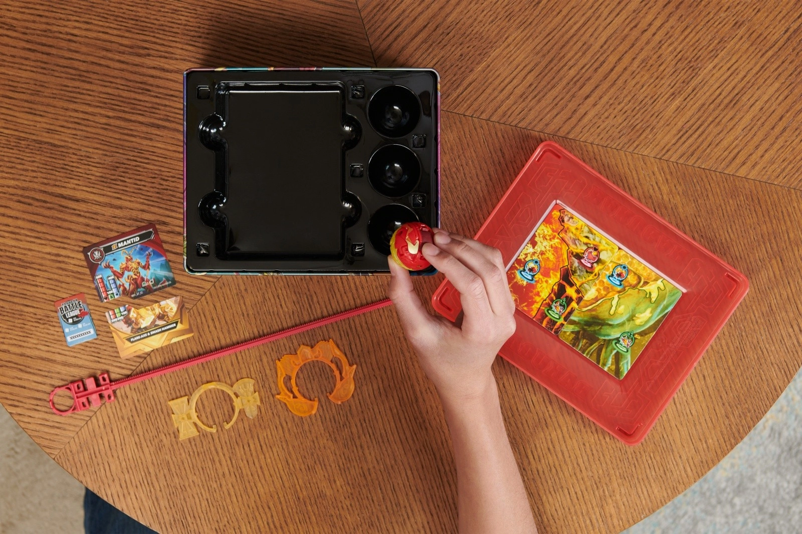 Pametna dvonadstropna razporeditev sprejme do 6 Bakuganov, 2 paketa kart in napadalne obroče. Odstranljiv pokrov takoj spremeniš v areno za dvoboj kjerkoli.