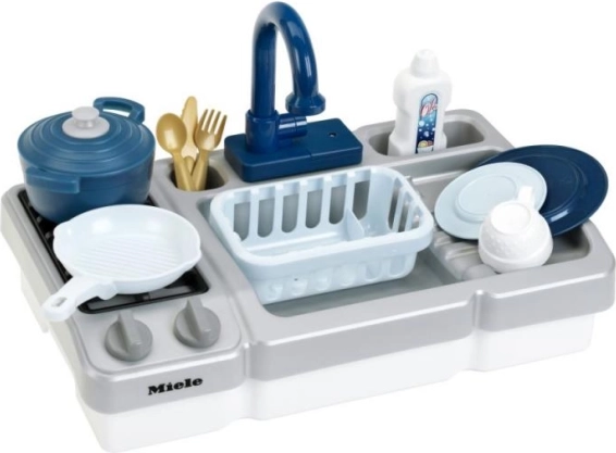 Razveselite male pomočnike v kuhinji. Otroško korito MIELE ponuja realistično igro zahvaljujoč funkciji tekoče vode iz pipe ter praktični posodi za pomivanje in sušenje. Odporna plastična izvedba je lahka, varna in enostavna za čiščenje.