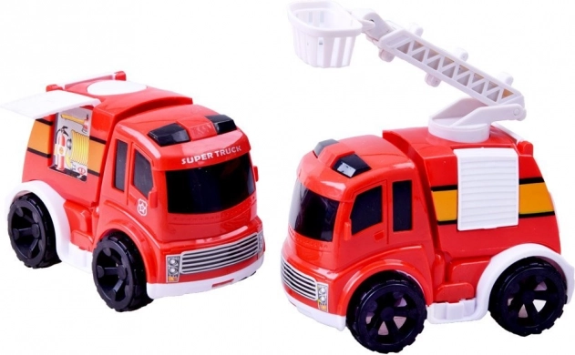V kompletu sta dva rdeča avtomobilčka z dovršeno izdelavo, eden z izvlečno lestvijo. Idealno za reševalne scenarije in vožnjo po postaji.