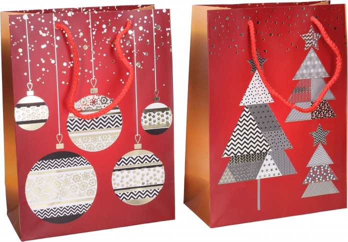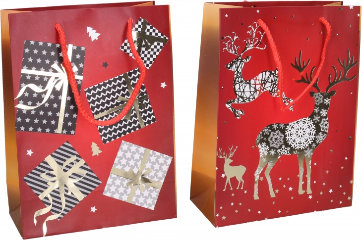 Božična darilna vrečka S (18 × 24 × 8,5 cm) v 4 motivih. Elegantno in hitro zavijanje manjših daril, trdna izvedba in praznični dizajn.