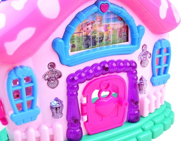 Zabavne funkcije vključujejo pasje lajanje, veselo melodijo in svetlobne učinke, ki otroke zares potegnejo v igro. Zaradi bogate opreme s pohištvom lahko otroci uredijo svojo hišo po želji.