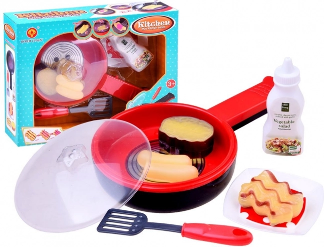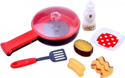 Set vsebuje ponev, pokrovko, več vrst živil in dodatke, ki jih otroci lahko uporabijo pri igri kuhanja.