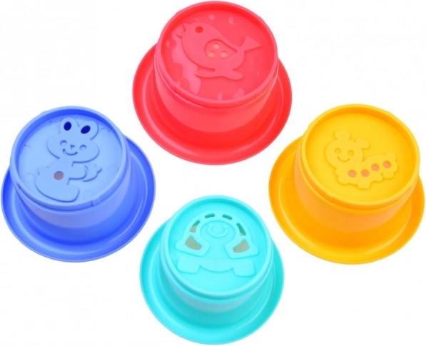 Štirje lončki različnih velikosti spodbujajo razvrščanje, zlaganje in razvoj fine motorike ter prepoznavanje barv.