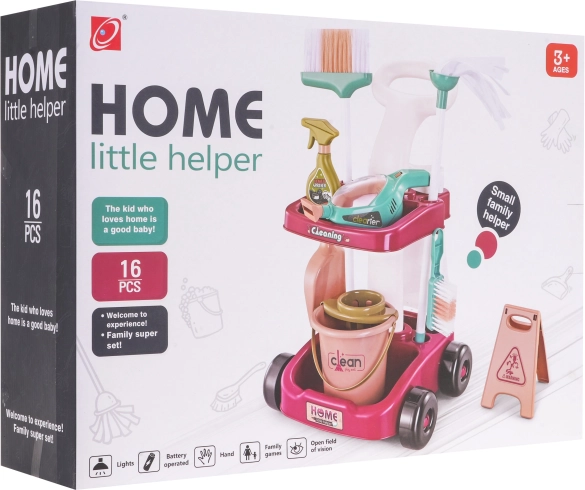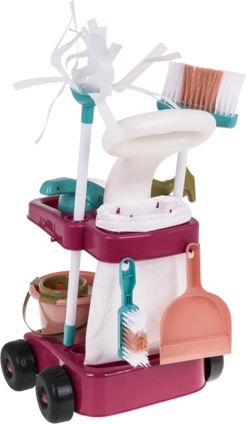 Ta bogat čistilni set je izdelan iz kakovostnih in varnih materialov ter navduši male pomočnike z realističnimi detajli. Otroci vadijo motoriko, osvojijo navade reda in uživajo v kreativni igri vlog doma in v vrtcu. Voziček je enostaven za upravljanje zahvaljujoč velikim kolesom in udobnemu ročaju, vse ima svoje mesto na praktičnih policah.