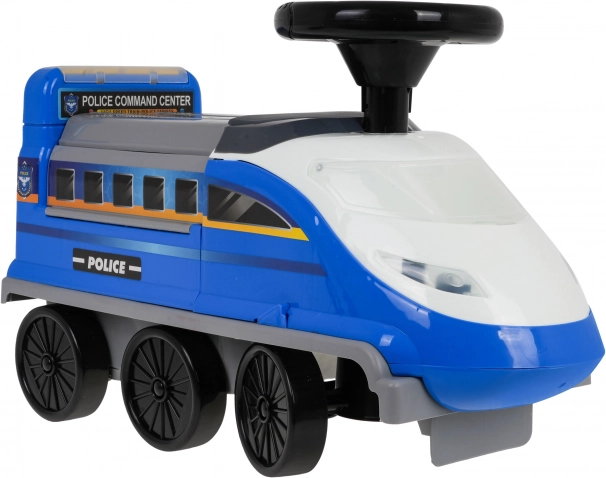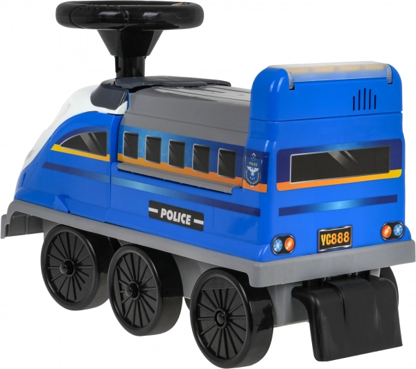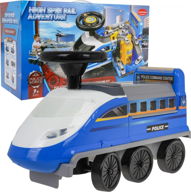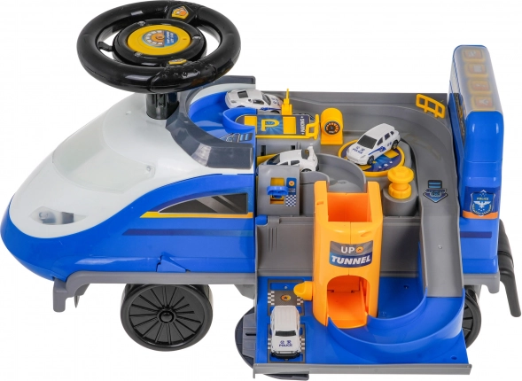 Interaktivni poganjalec – vlak s policijskim parkiriščem je idealen za otroke od 3 let. Ta inovativen poganjalec je izdelan iz visokokakovostne in netoksične plastike, ki zagotavlja dolgo življenjsko dobo in varnost. Vlak je opremljen s šestimi kolesi, od katerih sta sprednji dve vrtljivi, pod sedežem pa je zložljivo policijsko parkirišče s številnimi premičnimi elementi, vključno s tobogani, dvigalom in zapornicami, ki jih lahko prilagodite po svojih željah.