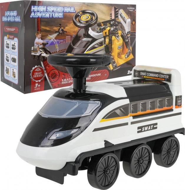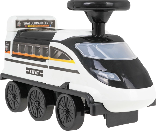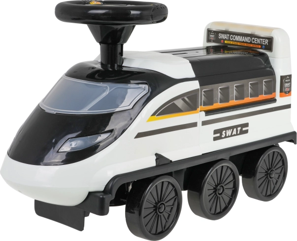 Interaktivni poganjalnik v obliki lokomotive prinaša neponovljive igralne izkušnje. Izdelan je iz visokokakovostne, trpežne in nestrupene plastike. Ta poganjalnik omogoča vožnjo na šestih kolesih, od katerih sta prednji dve vrtljivi. Pod sedežem se skriva raztegljiv policijski park z rampami, gibljivim dvigalom, dvižno zapornico, dvigalko in vrtljivim koleščkom.