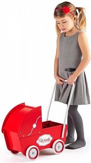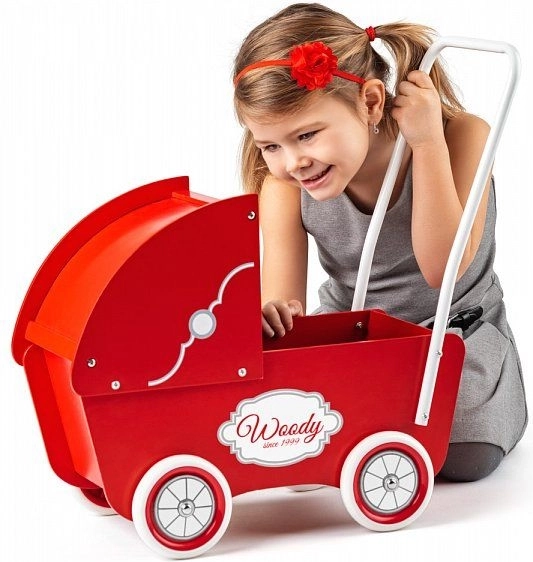 Rdeč lesen voziček za punčke z retro videzom je idealen za otroke od 3 let. Zaradi kakovostne lesene izdelave in gladko se vrtečih kolesc je voziček stabilen in enostaven za upravljanje doma in na sprehodu.
