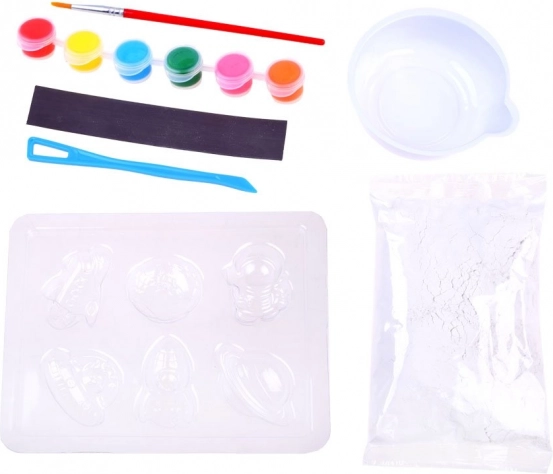 Set vsebuje mavčno maso, posodico, mešalnik, 6 barv, čopič, magnetni trak in navodila – dodati je treba le vodo in začeti ustvarjati.