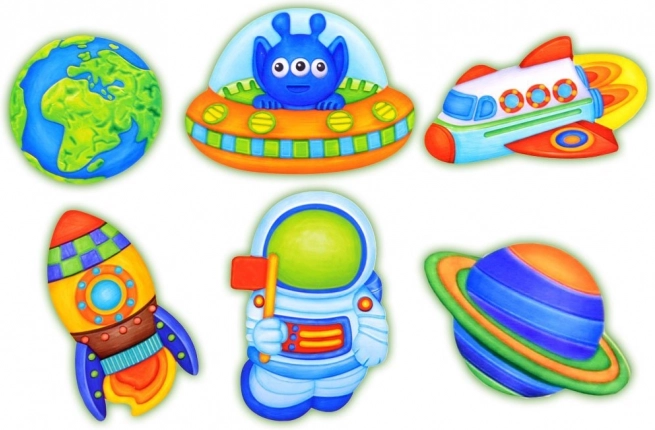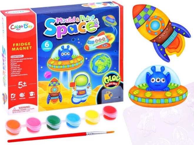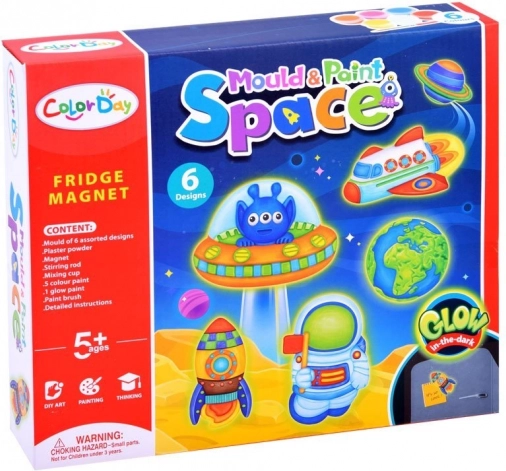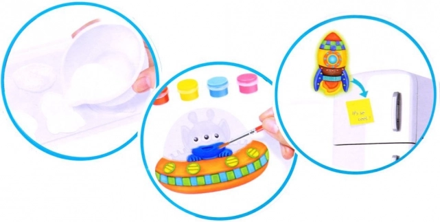 Z vključenimi modelčki in barvami si otroci izdelajo izvirne magnete z motivi raket, planetov in astronavtov. Ustvarjanje je preprosto in zabavno.
