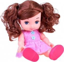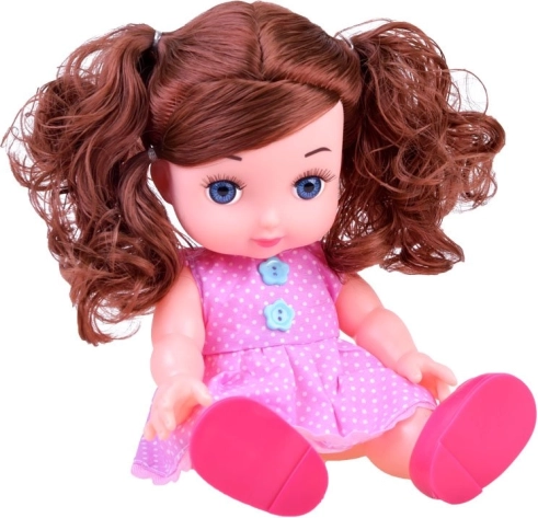 Lutka ima dolge kodraste lase in živo modre oči s trepalnicami, ki ji dajejo realističen in živ izraz.