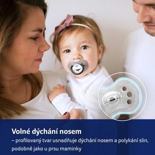 Ergonomsko oblikovan, izrezan ščit z velikimi prezračevalnimi odprtinami omogoča prosto dihanje skozi nos in zmanjšuje nabiranje sline, s čimer preprečuje draženje občutljive kože. Varen silikon je brez okusa in vonja, enostaven za čiščenje in ima dolgo življenjsko dobo. Praktičen ročaj z obročkom olajša podajanje in pripenjanje verižice, potovalni etui pa ohranja dudo higiensko čisto.