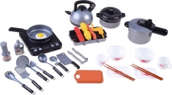 Ta prenosni kuhinjski komplet je idealen za vsakega malega kuharja. Nudi popolno opremo, vključno s čajnikom, kuhalno ploščo, ekonom loncem in številnimi drugimi dodatki, ki so potrebni za kuhanje in pečenje na žaru.