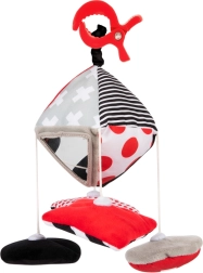 Spodbujajte otrokove čute od prvih dni življenja s kontrastno visečo igračo s sponko iz kolekcije SENSORY. Vzorce v visokem kontrastu v črno-belo-rdeči barvi, šušteče in zvoneče elemente, ropotuljico ter dvojico varnih ogledalc podpirajo vid, pozornost in motoriko. Zahvaljujoč praktični sponki igračo preprosto pritrdite na voziček, posteljico ali avtosedež. Odstranljivi plišasti elementi z magnetom prinašajo nove dražljaje ob vsakem sprehodu.