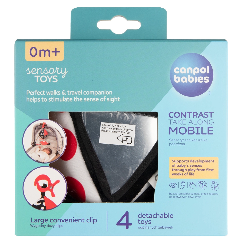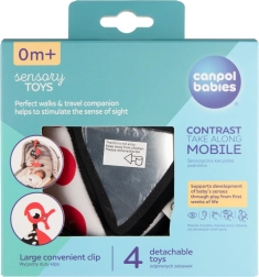 Kontrastna viseča igrača Canpol babies SENSORY je zasnovana za najmlajše otroke od 0+. Visok barvni kontrast (črna, bela, rdeča) podpira naravni razvoj vida, medtem ko raznolike teksture, zvoki in varna ogledalca spodbujajo radovednost in koncentracijo. Zaradi enostavne pritrditve s sponko jo lahko uporabljate doma in na poti.