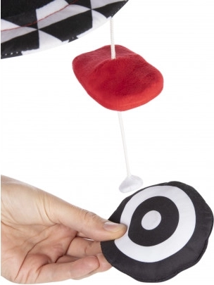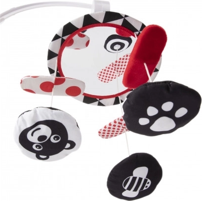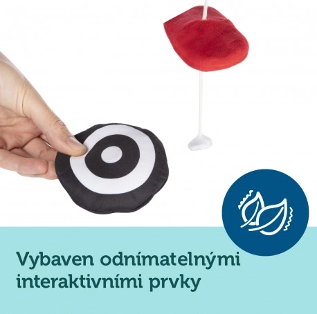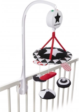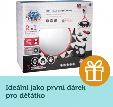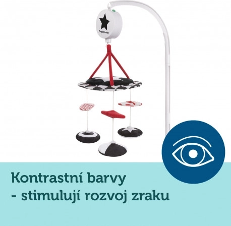 Kontrastni plišasti vrtiljak z melodijami iz kolekcije SENSORY je namenjen pritrditvi nad posteljico za najmlajše otroke. Vrtiljak je opremljen z glasbenim mehanizmom, velikim ogledalcem in odstranljivimi plišastimi elementi z všitim magnetom. Na vrtiljaku je mogoče predvajati do 12 melodij, ki odlično pomagajo pri uspavanju. Senzorične barve in melodije spodbujajo razvoj otrokovega zaznavanja ter njegovo vidno-slušno koordinacijo. Več informacij o izdelku najdete v tem videu: https://www.youtube.com/watch?v=xFGM2JqeIwE Zakaj so senzorične igrače tako pomembne? Otrokov vid je po rojstvu najmanj razvit čut. Tema, ki prevladuje v maternici, ne omogoča, da bi se vid v prenatalnem obdobju v celoti razvil. Po rojstvu je otrokovo videnje zamegljeno in megleno. Otrok vidi le obrise na razdalji 20–30 cm, velike oblike in elemente iz okolja. Približno po enem mesecu začne zaznavati barve, sprva rdečo in črno. Približno po treh mesecih začne opažati tudi druge izrazite barve. Okoli šestega meseca starosti začne videti podrobnosti na slikah in vidi mnogo bolj jasno. V dvanajstem mesecu življenja je otrokova vidna zaznava že v celoti razvita kot pri odraslem in postane odlično orodje za odkrivanje sveta. Senzorične igrače iz nove kolekcije SENSORY tako pomagajo spodbujati otrokovo vidno zaznavanje in urijo sposobnost osredotočanja že od prvih tednov življenja. O kolekciji SENSORY: Senzorična kolekcija igrač je bila razvita za otroke do enega leta starosti. V tem obdobju prihaja do najpomembnejših sprememb v psihomotoričnem razvoju otroka. Senzorične igrače so odgovor na aktualni trend na trgu, ki se osredotoča na podporo razvoja skozi igro, pri čemer lahko starš skupaj z otrokom spodbuja razvoj vida, vadi sposobnost osredotočanja na predmet, usmerjanje in sledenje predmetom z očmi ter vadi spretnost in koordinacijo. Opozorilo: Vrtiljak namestite tako, da otrok ne bo mogel priti z njim v neposreden stik. Igračo sestavite po priloženem načrtu (posamezni deli se lahko razlikujejo od prikazanih na načrtu). Igrače se premikajo, melodije otroka pomirijo in mu olajšajo uspavanje. Navodila za uporabo: Ohranite čistočo, glasbeni mehanizem brišite z vlažno krpo ali gobo. Navodila za vzdrževanje plišastih elementov so navedena na všivni etiketi. Opozorilo! Pomembno za zdravje in varnost vašega otroka! Ne uporabljajte igrače za otroke, ki se začenjajo samostojno dvigovati na roke in kolena. Tako preprečite morebitno zapletanje otroka v igračo. Opozorilo! Montažo in preverjanje sestave igrače pred uporabo vedno zaupajte le odrasli osebi. Opozorilo! Pomembno! Igračo pritrdite nad otrokovo glavico v njegovem vidnem polju. Pred vsako uporabo izdelek preverite. Ob prvih znakih obrabe ali poškodb izdelka ne uporabljajte več – zamenjajte ga z novim. Vrtiljak izpolnjuje zahteve: Direktiva Evropskega parlamenta in Sveta 2009/48/ES o varnosti igrač EN 71 - 1 Varnost igrač - Del 1: Mehanske in fizikalne lastnosti EN 71 - 2 Varnost igrač - Del 2: Vnetljivost EN 71 - 3 Varnost igrač - Del 3: Migracija določenih elementov
