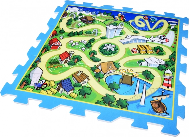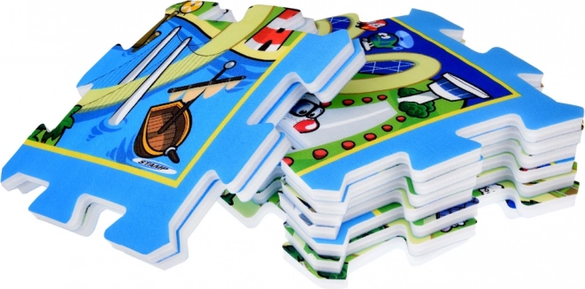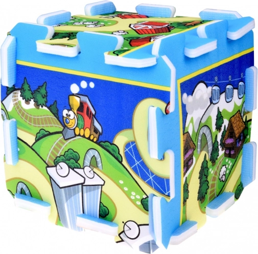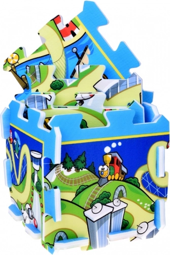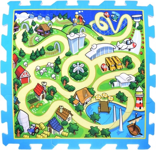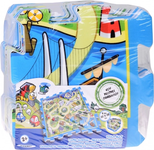 Ta penasta podloga/puzzle z motivom mesta in cest spremeni vsak prostor v zabavno prometno območje. Deli iz mehke, a trpežne pene ustvarjajo oblazinjen in varen površino za sedenje, plazenje in prve korake. Otroci se lahko vozijo z avtomobilčki po cestah, učijo barve in oblike ter razvijajo domišljijo.