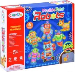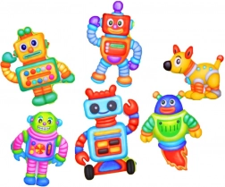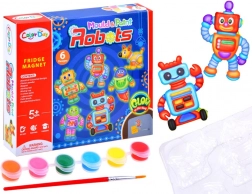 Komplet omogoča otrokom ustvarjanje in barvanje robotskih magnetov po njihovi domišljiji.