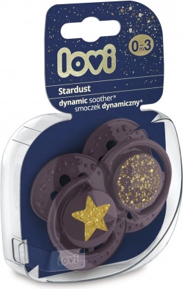 Stardust je tukaj! Edinstvena, oblikovno izstopajoča, premium kolekcija LOVI. Unikaten dizajn kolekcije Stardust – okras v obliki zlatih bleščic, ki spominjajo na zvezdnato nebo. Kolekcija se ponaša z dinamičnim dudkom LOVI velikosti 0–3 m, ki je bil ustvarjen v sodelovanju z nevrologopedi z namenom zagotoviti naraven in zdrav razvoj otrokovega neba, zob in dlesni. Gumica dudka se dinamično prilagaja sesanju otroka in ne moti sesalnega refleksa. Ne vsebuje BPA. V pakiranju 2 kosa. VSI SMO USTVARJENI IZ ZVEZD Dinamični dudek LOVI je bil ustvarjen v sodelovanju z nevrologopedi, da zagotovi naraven in zdrav razvoj neba, zob in dlesni otroka. Silikonski simetrični dinamični dudek LOVI je bil klinično preizkušen. Vsi dudki LOVI so izdelani iz silikona, ki je brez okusa in vonja. Silikonski dudki imajo daljšo življenjsko dobo in se lažje ohranjajo čisti. Edinstvena simetrična dinamična gumica se zelo dobro odzračuje in ne deformira otrokovega neba. preprečuje refleks grizenja dudka omogoča naravno požiranje sline podpira zdrav razvoj govora in oblikovanje ugriza ne deformira otrokovega neba zelo dobro se odzračuje Dinamična gumica je izdelana iz neenakih plasti silikona, zato se podaljšuje in krči glede na ritem otrokovega sesanja. Simetrična oblika spominja na materino bradavico. Oblika gumice omogoča tudi vstavljanje dudka v otrokova usta v katerikoli smeri (nima določene zgornje in spodnje strani). Oblikovan, izrezan ščit omogoča otroku prosto dihanje skozi nos. Izdelan je iz varnega materiala, ki ne vsebuje BPA. Edinstven rob ščita je iz medicinskega materiala, je prijeten na dotik in preprečuje odtise dudka. Odprtine v ščitu omogočajo kroženje zraka, preprečujejo nabiranje sline za ščitom in s tem ščitijo občutljivo otroško kožo pred draženjem. Obroč na dudku trdno drži, olajša držanje in podajanje dudka. Nanjo lahko pripnete verižico ali vrvico. Dudek je iz higienskih razlogov opremljen s plastičnim pokrovčkom. Plastična škatlica služi kot etui za higiensko shranjevanje dudkov. Dudki LOVI so prejeli nagrade končnih potrošnikov. Dudki so dobavljeni v številnih sodobnih barvnih dizajnih. Set vsebuje: 2 kosa dinamičnih dudkov LOVI 2 kosa plastičnih pokrovčkov za dudek 1 kos plastične škatlice Navodila za uporabo: Pred prvo uporabo dudek iz higienskih razlogov sterilizirajte v vreli vodi približno 5 minut. Po ohladitvi iztisnite preostalo vodo iz dudka. Pred vsako uporabo dudek umijte v topli vodi. Ne uporabljajte nobenih kemičnih razkužil! Visoka koncentracija teh sredstev lahko poškoduje plastične dele dudka. Nikoli ne namakajte dudka v sladkih substancah ali zdravilih – izpostavljate otroka nevarnosti nastanka okvare zobne sklenine. Dudek uporabljajte največ 1–2 meseca, nato ga iz higienskih in varnostnih razlogov zamenjajte z novim. Če dudek zdrsne otroku v usta, NE PANICIRAJTE – dudek je zasnovan tako, da ga otrok ne more pogoltniti, vi pa ga lahko v takih primerih varno odstranite. Dudek odstranjujte čim bolj previdno. Dudek shranjujte v čistem, suhem in zaprtem etuiju. Dudka ne priporočamo za otroke starejše od 3 let. Opozorilo! Pomembno za zdravje in varnost vašega otroka! Pred vsakim dajanjem otroku preverite kakovost dudka. Posebno pozornost mu namenite potem, ko otroku zrastejo prvi zobki. Preverite kakovost gumice z natančnim raztezanjem v vse smeri. Ob prvih znakih poškodbe dudek takoj zavrzite in ga ne uporabljajte več. Uporabljajte le take držala za dudek, ki izpolnjujejo zahteve standarda EN12586. Nikoli ne pritrdite dudka na različne vrvice, vezalke ali trakove oblačil. Otrok se lahko zaduši. Dudka ne puščajte na neposredni sončni svetlobi, v bližini vira toplote ali v razkužilnih sredstvih dlje, kot je priporočeno – lahko povzročite oslabitev gumice dudka. Snemljen pokrov hranite izven dosega otroka – preprečili boste morebitno zadušitev. Silikonski dudek izpolnjuje zahteve: Direktiva Evropskega parlamenta in Sveta 2001/95/ES o splošni varnosti proizvodov EN 1400 – 1 Izdelki za nego otroka – Dudki za dojenčke in majhne otroke – Del 1: Splošne varnostne zahteve in informacije o izdelku EN 1400 – 2 Izdelki za nego otroka – Dudki za dojenčke in majhne otroke – Del 2: Mehanske zahteve in preskusi EN 1400 – 3 Izdelki za nego otroka – Dudki za dojenčke in majhne otroke – Del 3: Kemične zahteve in preskusi Dudki LOVI ne vsebujejo bisfenola A.