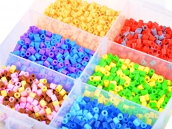 Trdna škatla s predelki ohranja perlice pregledno razporejene in varno shranjene. Priročni ročaj olajša prenašanje na potovanjih in v šolo.