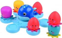 Ta privlačen kopalni komplet združuje zabavo in učenje. Otroci lahko opazujejo, kako kita plava, prši vodo ter kako pisane hobotničke ostajajo na gladini ali gladkih površinah. Komplet razvija koordinacijo oko–roka, podpira čutno zaznavanje in spremeni vsakodnevno higieno v vesel obred.