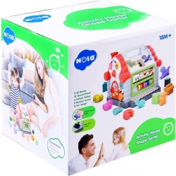 Del kompleta je 11 različnih 3D kock (oblike in živalice) za vstavljanje v ustrezne odprtine ter posebna gumijasta odprtina za tipno ugibanje oblik. Igrača naravno spodbuja radovednost, samostojno raziskovanje in senzorično zaznavanje.