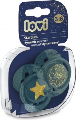 Stardust je tukaj! Edinstvena, oblikovno izstopajoča, premium kolekcija LOVI. Unikaten dizajn kolekcije Stardust – okras v obliki zlatih bleščic, ki spominjajo na zvezdnato nebo. Kolekcija se ponaša z dinamičnim dudom LOVI v velikosti 3–6 m, ki je bil ustvarjen v sodelovanju z nevrologopedi z namenom zagotoviti naraven in zdrav razvoj neba, zob in dlesni otroka. Cevka duda se dinamično prilagaja sesanju otroka in ne moti sesalnega refleksa. Ne vsebuje BPA. V pakiranju 2 kosa. VSI SMO USTVARJENI IZ ZVEZD Dinamični dudo LOVI je bil ustvarjen v sodelovanju z nevrologopedi z namenom zagotoviti naraven in zdrav razvoj neba, zob in dlesni otroka. Silikonski simetrični dinamični dudo LOVI je bil klinično testiran. Vsi dudi LOVI so izdelani iz silikona, ki je brez okusa in vonja. Silikonski dudi imajo daljšo življenjsko dobo in jih je lažje vzdrževati čiste. Edinstvena simetrična dinamična cevka se zelo dobro odzračuje in ne deformira otrokovega neba. preprečuje refleks grizenja duda omogoča naravno požiranje sline podpira zdrav razvoj govora in oblikovanje ugriza ne deformira otrokovega neba zelo dobro se odzračuje Dinamična cevka je izdelana iz nehomogenih slojev silikona, zato se podaljšuje in krči glede na ritem otrokovega sesanja. Simetrična oblika spominja na materino bradavico. Oblika cevke omogoča tudi vstavljanje duda v otrokova usta na katerikoli način (nima določene zgornje in spodnje strani). Oblikovana izrezana oblika ščitnika omogoča otroku prosto dihanje skozi nos. Izdelan je iz varnega materiala, ki ne vsebuje BPA. Edinstiven rob ščitnika je izdelan iz medicinskega materiala, je prijeten na dotik in preprečuje odtise duda. Odprtine v ščitniku omogočajo kroženje zraka, odpravljajo nabiranje sline za ščitnikom in tako preprečujejo draženje občutljive otroške kože. Obroč na dudu trdno drži, olajša držanje in podajanje duda. Nanjo lahko pripnete verižico ali vrvico. Dudo je iz higienskih razlogov opremljen s plastičnim pokrovčkom. Plastična škatlica služi kot etui za higiensko shranjevanje dudov. Dudi LOVI so prejeli priznanja končnih potrošnikov. Dudi so dobavljeni v številnih modernih barvnih dizajnih. Set vsebuje: 2 kosa dinamičnih dudov LOVI 2 kosa plastičnih pokrovčkov za dudo 1 kos plastične škatlice Navodila za uporabo: Pred prvo uporabo dudo iz higienskih razlogov sterilizirajte v vreli vodi približno 5 minut. Po ohladitvi iztisnite preostalo vodo iz duda. Pred vsako uporabo dudo umijte v topli vodi. Ne uporabljajte nobenih kemičnih razkuževalnih pripravkov! Visoka koncentracija teh pripravkov lahko poškoduje plastične dele duda. Nikoli ne namakajte duda v sladkih snoveh ali zdravilih – otroka izpostavljate nevarnosti nastanka okvare zobne sklenine. Dudo uporabljajte največ 1–2 meseca, nato ga iz higienskih in varnostnih razlogov zamenjajte z novim. Če dudo zdrsne otroku v usta, NE PANICIRAJTE – dudo je zasnovan tako, da ga otrok ne more pogoltniti, in ga lahko v takih primerih varno odstranite. Dudo odstranjujte čim bolj previdno. Dudo shranjujte v čistem, suhem in zaprtem etuiju. Ne priporočamo uporabe duda za otroka, starejšega od 3 let. Opozorilo! Pomembno za zdravje in varnost vašega otroka! Pred vsakim dajanjem otroku preverite kakovost duda. Posvetite dudu povečano pozornost potem, ko otroku zrastejo prvi zobki. Preverite kakovost cevke s temeljitim raztezanjem v vse smeri. Ob prvih znakih poškodb dudo takoj zavrzite in ga ne uporabljajte več. Uporabljajte le tiste držala za dudo, ki ustrezajo zahtevam standarda EN12586. Nikoli ne pripenjajte duda na različne vrvice, vezalke ali trakove oblačil. Otrok se lahko zaduši. Duda ne puščajte na neposredni sončni svetlobi, v bližini vira toplote ali v razkuževalnih sredstvih dlje, kot je priporočeno – to lahko povzroči oslabitev cevke duda. Snemljen pokrov hranite izven dosega otroka – s tem preprečite možno zadušitev. Silikonski dudo ustreza zahtevam: Direktiva Evropskega parlamenta in Sveta 2001/95/ES o splošni varnosti proizvodov EN 1400 – 1 Izdelki za nego otrok – Dudi za dojenčke in majhne otroke – Del 1: Splošne varnostne zahteve in informacije o izdelku EN 1400 – 2 Izdelki za nego otrok – Dudi za dojenčke in majhne otroke – Del 2: Mehanske zahteve in preskusi EN 1400 – 3 Izdelki za nego otrok – Dudi za dojenčke in majhne otroke – Del 3: Kemične zahteve in preskusi Dudi LOVI ne vsebujejo bisfenola A.