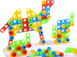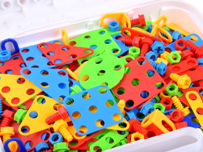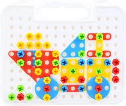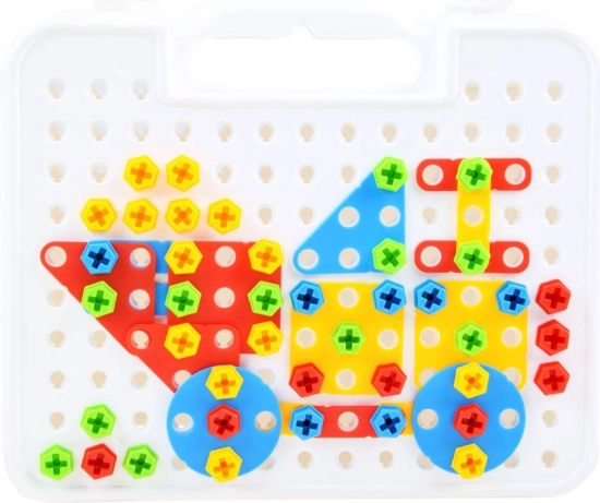 Ta kreativni gradbeni komplet za male mojstre ponuja neomejene možnosti sestavljanja. Otroci lahko ustvarjajo 2D slike in 3D modele s pomočjo perforirane plošče, vijakov in pisanih delčkov različnih oblik. Kovček z ročajem zagotavlja enostavno prenašanje in pregledno shranjevanje vseh komponent.