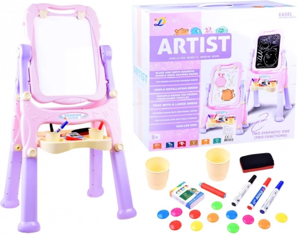 Ta barvita dvostranska tabla ponuja vse za male umetnike: na črni strani lahko pišete s kredo, bela magnetna stran pa je primerna za suhomazalne flomastre, magnetke ali pripenjanje papirjev za risanje. Praktična polička in lončki poskrbijo, da so krede, flomastri in čopiči vedno pri roki.