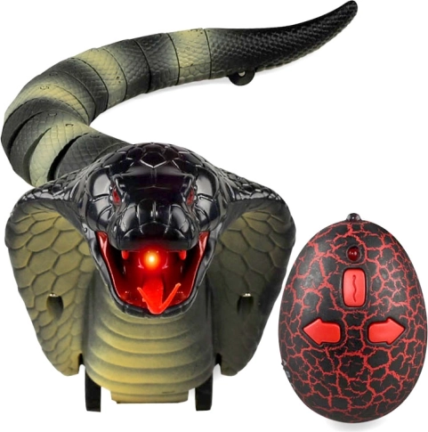 Ta daljinsko upravljana kobra zvesto posnema pravo gibanje kače in navduši z dovršeno izdelavo, vključno s kapuco in izrazitimi očmi. Zahvaljujoč kompaktnemu upravljalniku v obliki jajca jo zlahka usmerite, kamor želite – idealno za domačo zabavo, majhna presenečenja na zabavah in kot izvirno darilo.