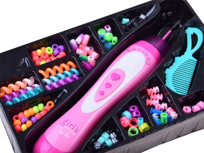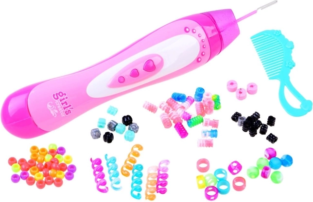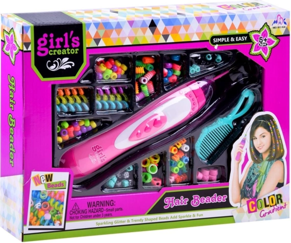 Odkrijte enostavno in zabavno okraševanje las s tem kompletom Girl's Creator. Ergonomski natikalnik vam pomaga hitro pritrditi perlice na izbrane pramene, zato si lahko otroci sami varno ustvarjajo pisane videze za vsak dan. Dovolj je pripraviti pramen, nasuti perlice v zalogovnik in z nežnim pritiskom natikati eno za drugo.