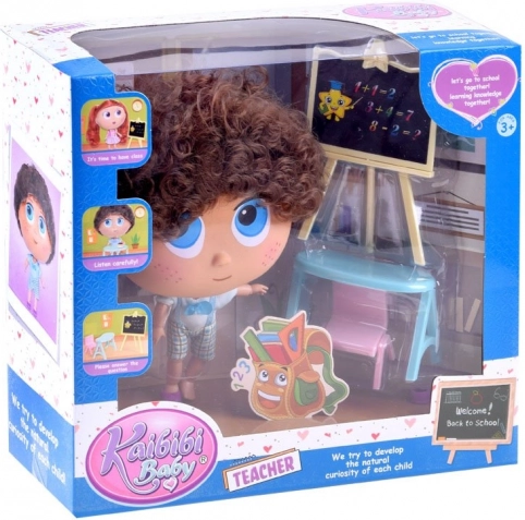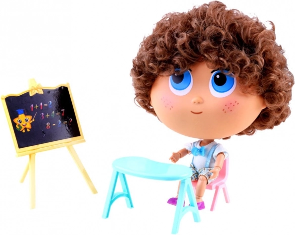 Prisrčna punčka učitelj Tymek za igro šole prinaša otrokom veliko domišljije in zabave. V paketu najdete tablo, mizo in stolček. Punčka ima gibljive sklepe in glavo, ki se vrti za 360°, velike modre oči, pegice in kodraste lase. Odlično za igranje vlog in razvoj ustvarjalnosti.