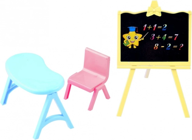 Popolna oprema za igro šole. Otroci lahko pišejo na tablo, posedejo punčko k klopi in ustvarjajo svoje učne ure.