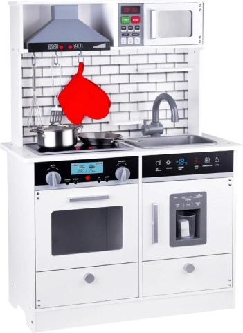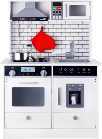 Ta čudovita lesena kuhinja je opremljena z vsemi potrebnimi aparati, ki otrokom omogočajo pripravo najokusnejših jedi. Slogana v beli barvi z modernimi ploščicami se bo popolnoma ujemala v vsak otroški igralni kotiček ali kuhinjski kotiček.