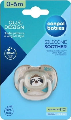Prisrčna dudo Canpol babies iz kolekcije EXOTIC ANIMALS z vzorcem lenivca je namenjena otrokom 0–6 mesecev. Ima simetrično obliko za naravno sesanje, izdelana je iz nežnega hipoalergenega silikona brez okusa in vonja, prezračevalne odprtine v ščitu pa varujejo občutljivo kožo. Svetleče jedro olajša iskanje dude ponoči, praktičen ročaj pa omogoča enostavno pripenjanje na trak.