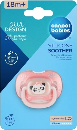 Duda Canpol babies Exotic Animals 18m+ združuje varnost, udobje in igriv dizajn z motivom pande. Simetričen silikonski cuclj se naravno prilagodi v ustih ne glede na položaj, kar zagotavlja mirno sesanje in zadovoljstvo otroka. Jedro, ki sveti v temi, olajša nočno iskanje.