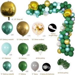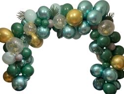 Montaža je preprosta: balone napihnite z zrakom ali helijem in jih pritrdite v trak z očesi. Manjše balone razporedite po obodu za poln in plasten učinek. Tropski in palmovi listi dodajo rezultatu eksotičen pridih in odlično dopolnjujejo zeleno-zlato paleto.