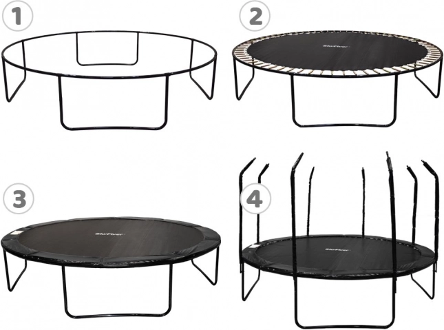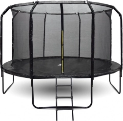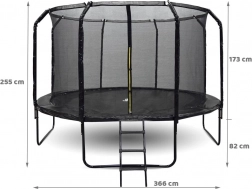 Visoka zaščitna mreža napeta z obročem dobro drži obliko, vstop je zavarovan z zadrgo in zaponko. Profilirani kovinski stebrički imajo mehko oblazinjenje za varno skakanje.