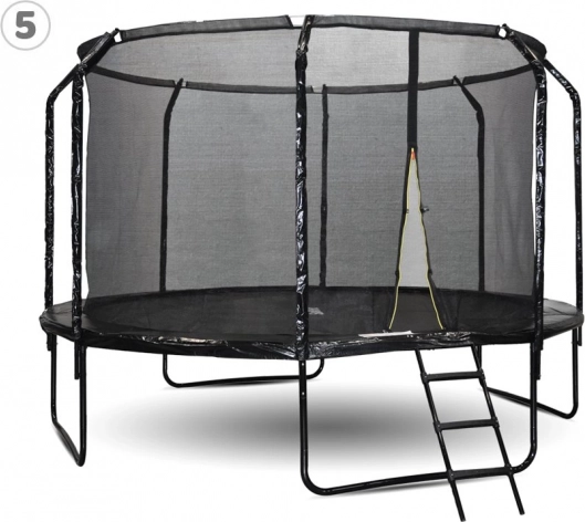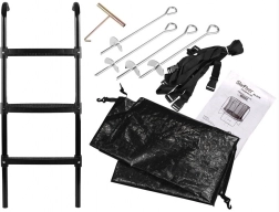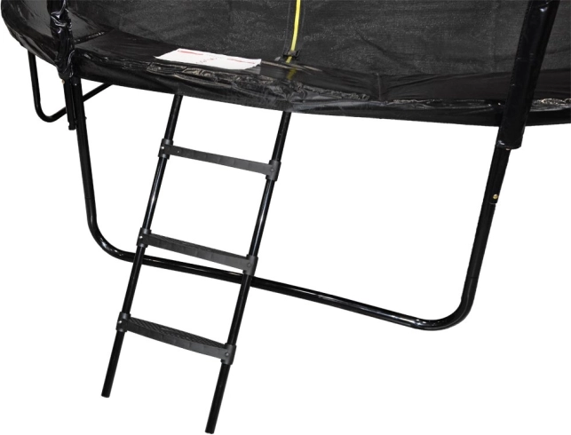 Masiven okvir z močnimi oksidiranimi vzmetmi in U-nogami drži trampolin trdno na mestu, medtem ko zaščitni rob varno prekriva vzmeti. Praktična tristopenjska lestev olajša vstop tudi otrokom. V paketu najdete tudi sidra s trakovi, vodoodporen pokrov in montažno orodje – vse za enostavno namestitev in brezskrbno uporabo.